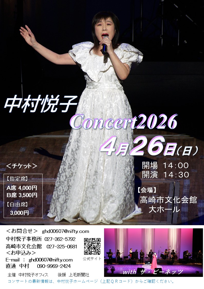 | 「中村悦子コンサート2026」は4月26日に開催いたします. |